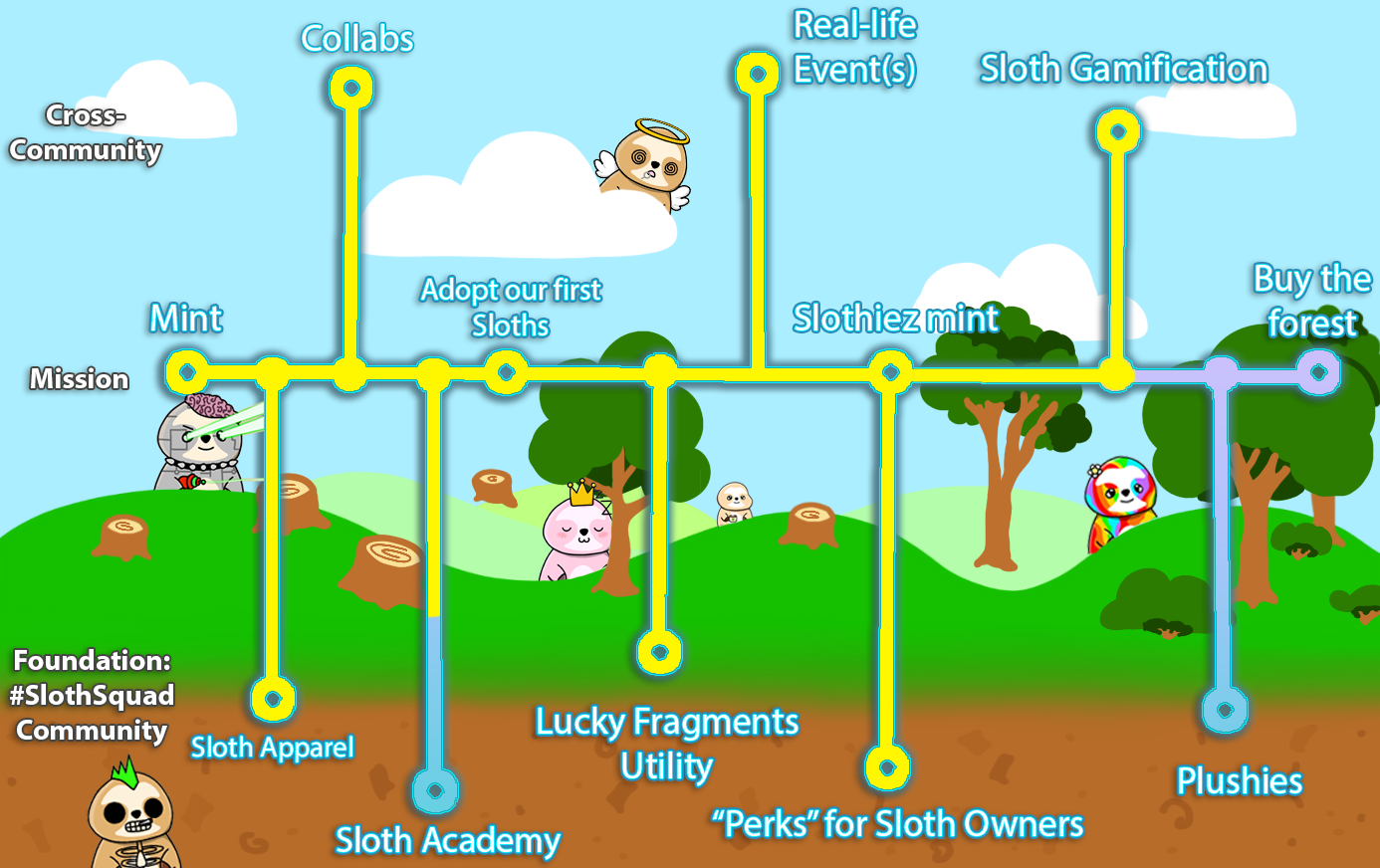 Our goal is to help as many Sloths as possible, to protect wildlife habitat and our planet, which is ultimately in our own best interest as well. Animal rights issues can be considered a high priority, as there are 100+ billion domesticated animals and even more wild animals who receive even less of our moral concern. Only 3% of philanthropic funding in the US is split between the environment and animals, while 97% goes toward helping humans. We are establishing ourselves in the NFT space to have the biggest impact we can. So if you love our cute, meme-able and relatable art, and at the same time want to be part of these important goals, definitely consider Lucky Sloths NFTs. We also have community-directed initiatives to help sloths based on Lucky Fragments, our off-chain currency through Discord, so definitely join our server to participate! We’ve adopted sloths through the Sloth Institute and the Sloth Conservation Foundation based in Costa Rica. We have also have sponsored Syd and Pauley at the Wildlife Learning Center in California, with whom we’ve partnered to allow our Verified Sloth Holders to visit them with a free entrance, more info in our Discord Server.